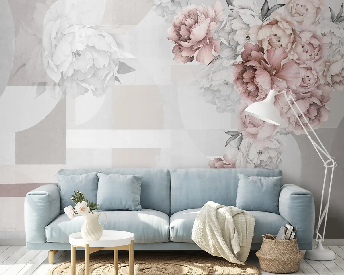 Fototapet Akvarelpæoner i lyserød farve med geometrisk baggrund Nr. u95855