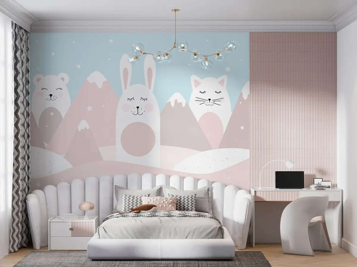Fototapet Kanin, bjørn, ræv på baggrund af beige snedækkede bjerge Nr. u98135