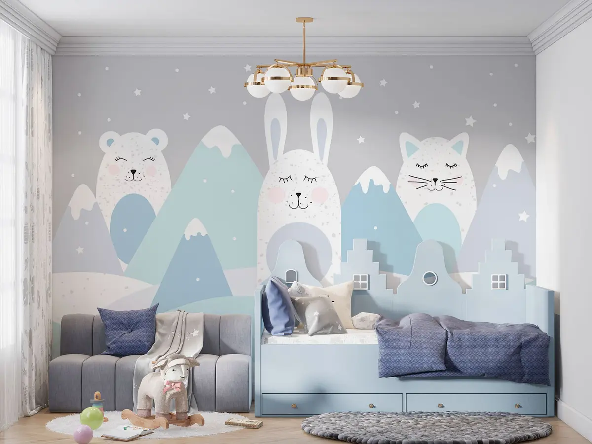 Fototapet Kanin, bjørn, ræv på baggrund af beige snedækkede bjerge Nr. u98135v1