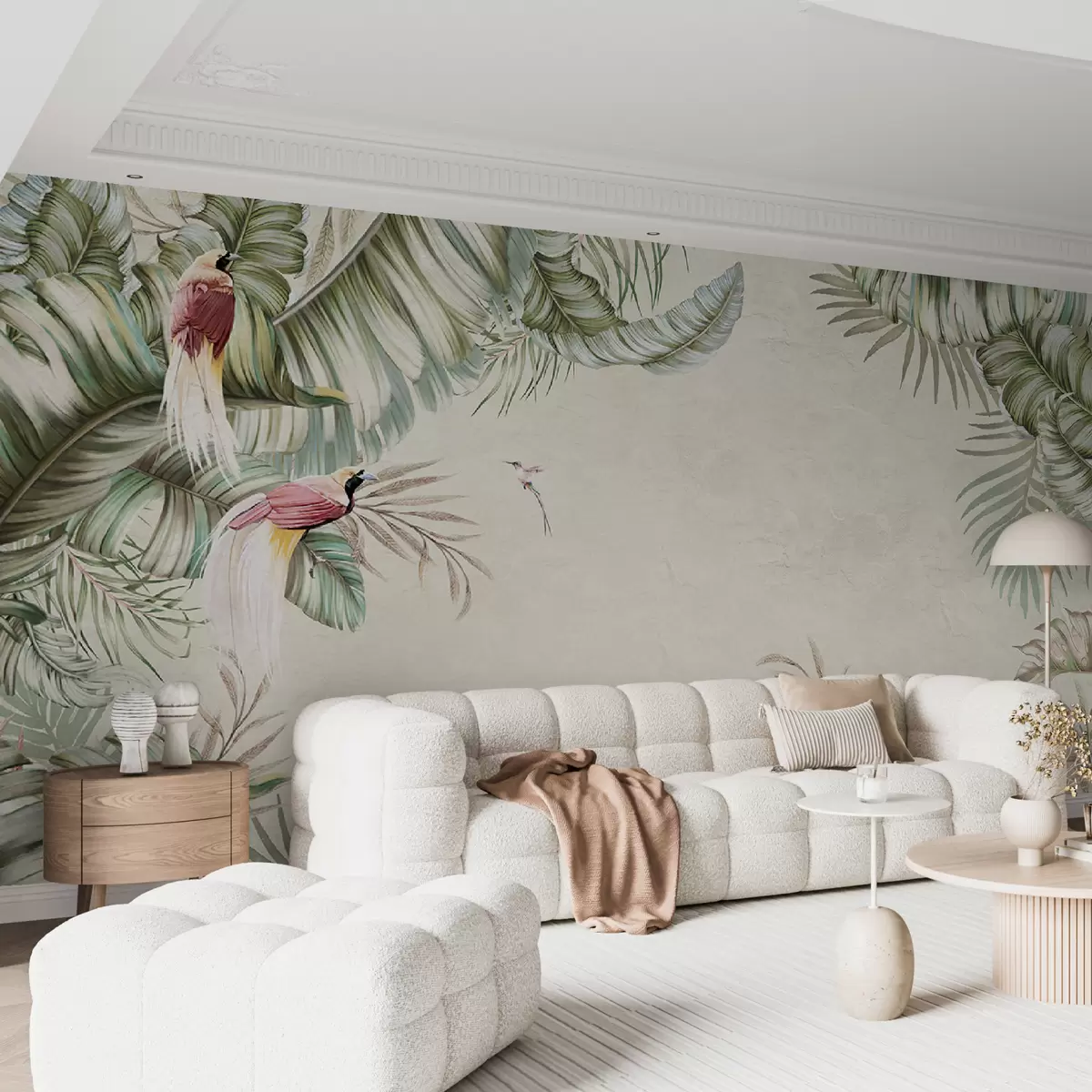 Fototapet Tropiske planter og fugle på struktureret baggrund Nr. u96550