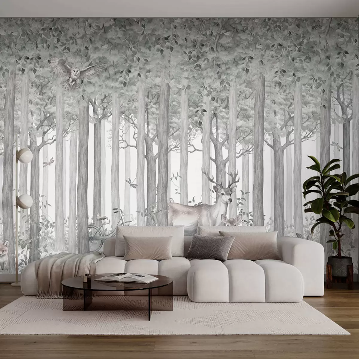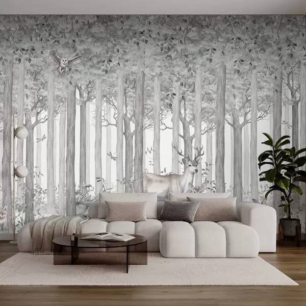 Fototapet Skovens dyr - hjort og ugle i gråt Nr. u97629v1