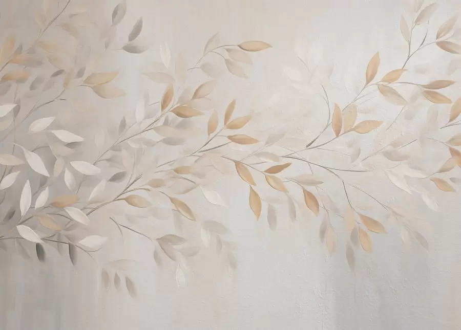 Tekstureret akvarelmaleri med efterligning af brune blade og grene, bløde farver, delikate detaljer mod en hvid baggrund