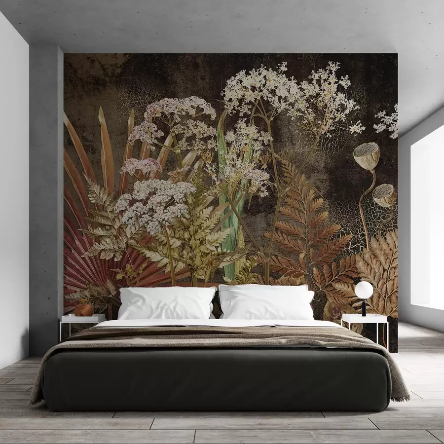 Blandt søjlerne er tropiske, eksotiske planter og blade.