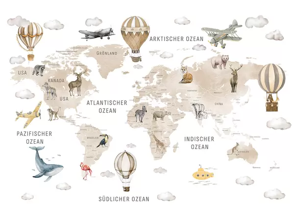 Fototapet Børnekort i akvarelstil med dyr og luftballoner. Tysk sprog. Beige farve. Nr. c00001dev2