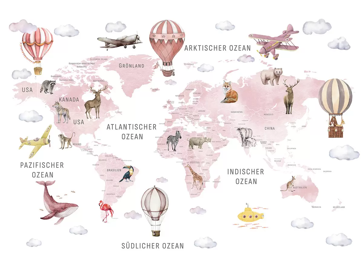 Fototapet Børnekort i akvarelstil med dyr og luftballoner. Tysk sprog. Lyserød farve. Nr. c00001dev3