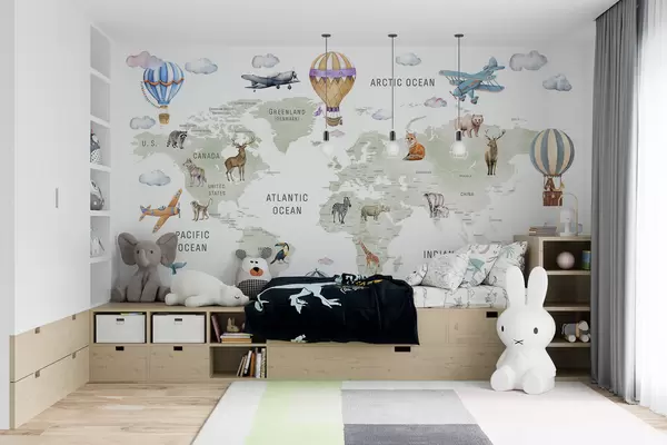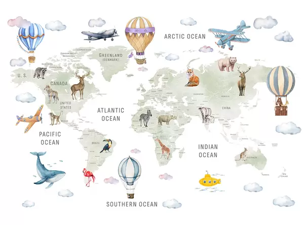 Fototapet Børnekort i akvarelstil med dyr og luftballoner. Engelsk sprog. Grøn farve. Nr. c00001en