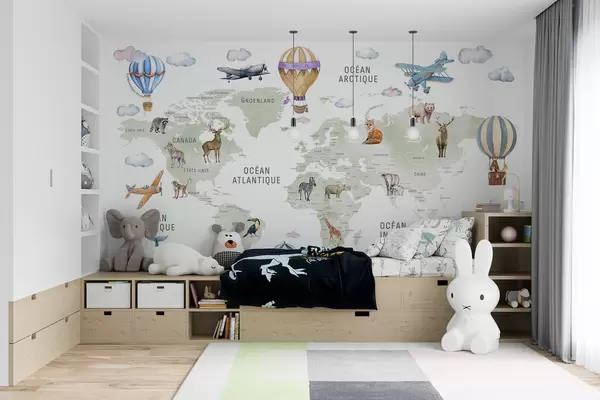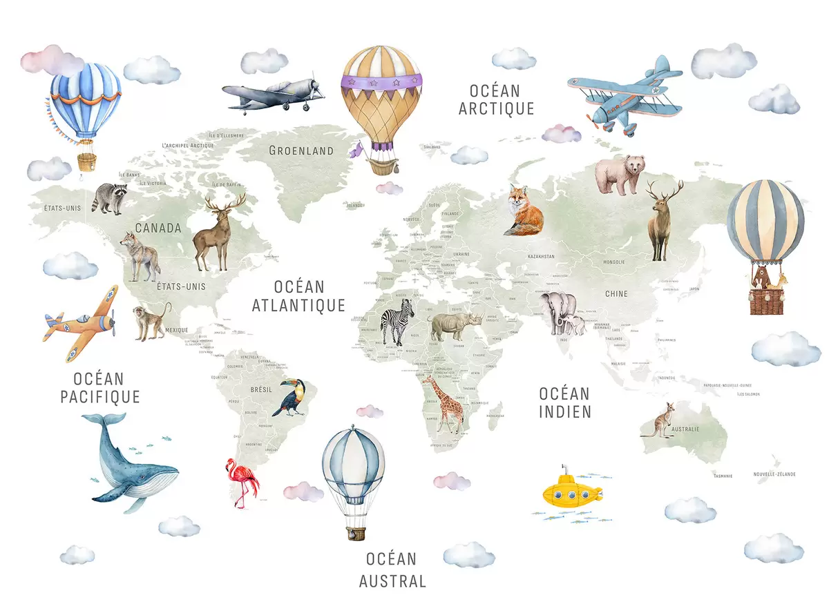 Fototapet Børnekort i akvarelstil med dyr og luftballoner. Fransk sprog. Grøn farve. Nr. c00001fr