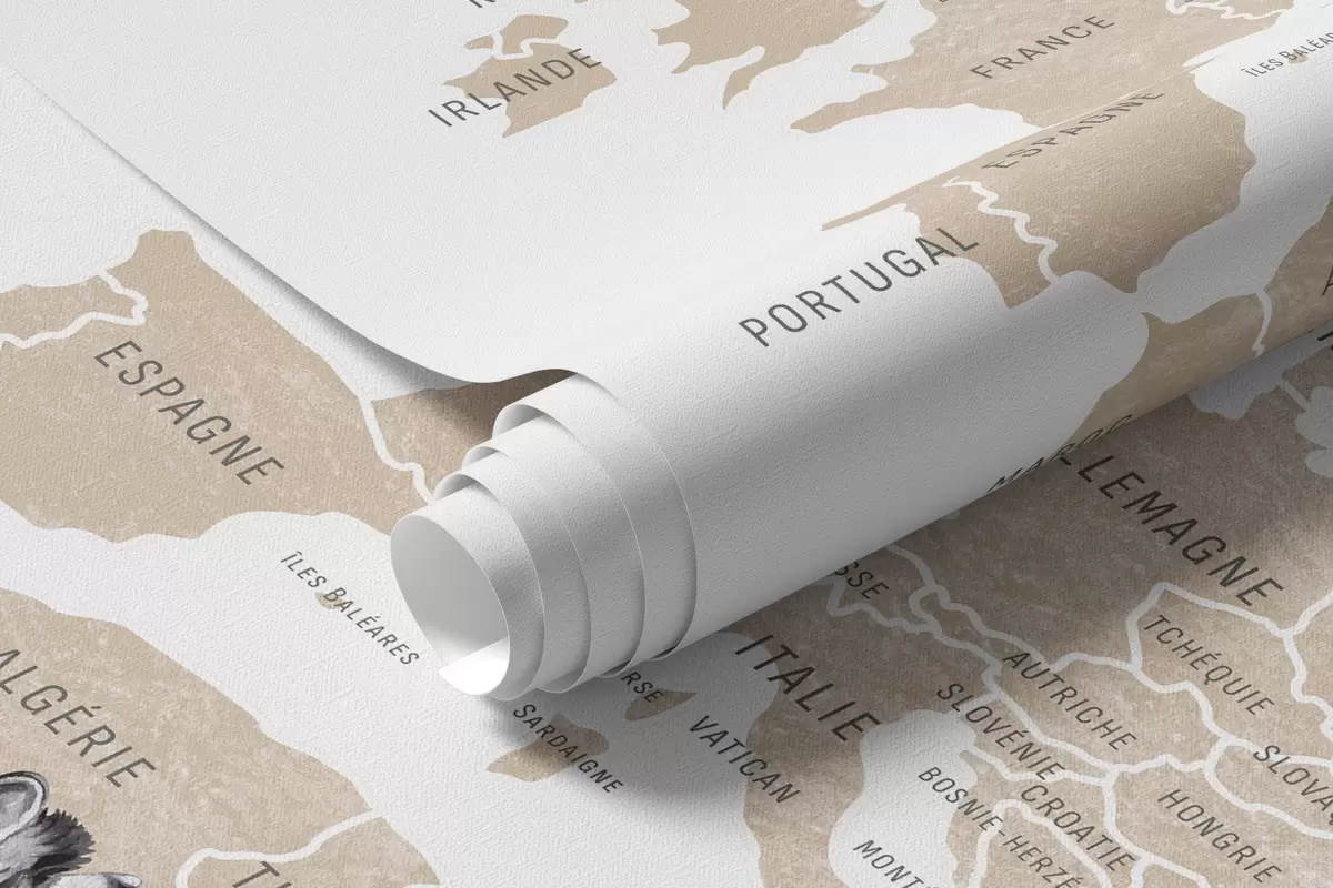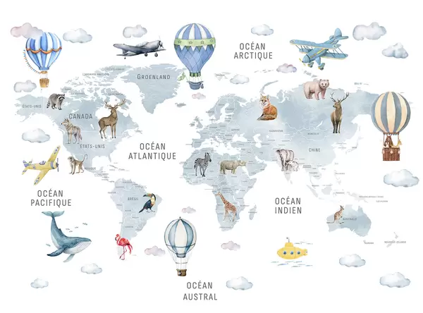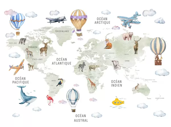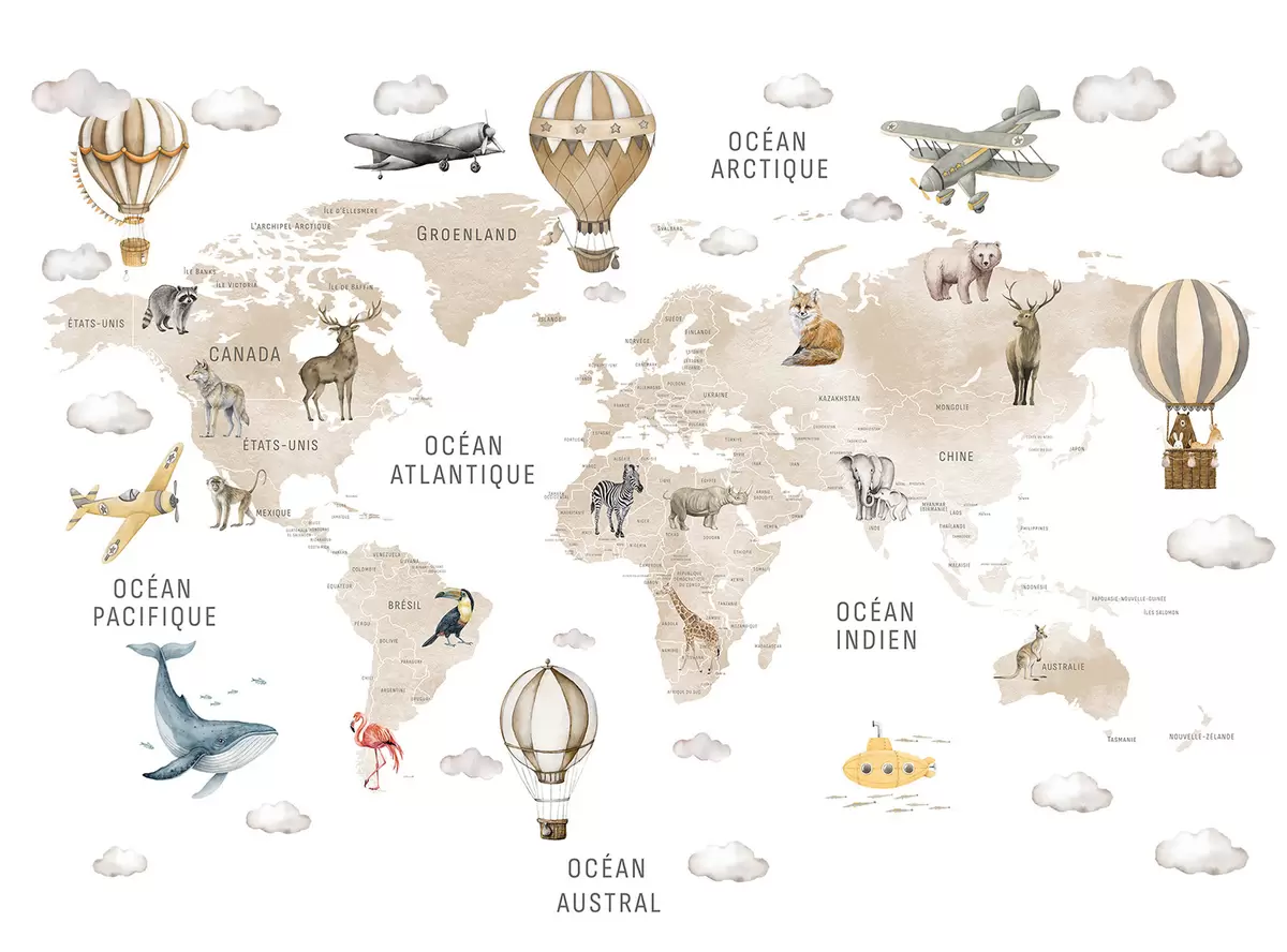 Fototapet Børnekort i akvarelstil med dyr og luftballoner. Fransk sprog. Beige farve. Nr. c00001frv2