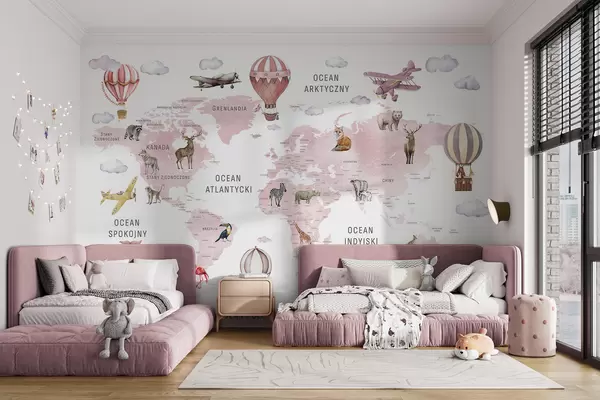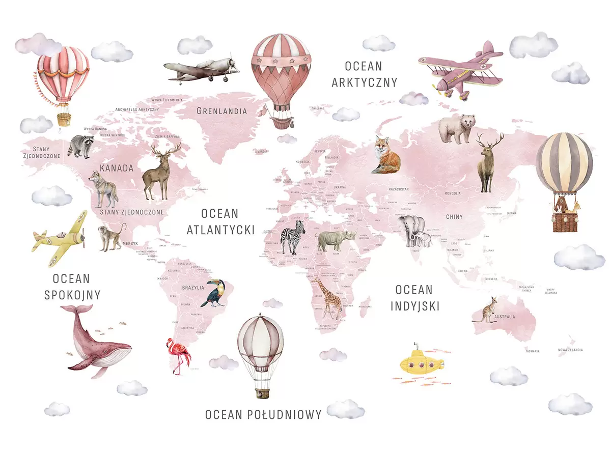 Fototapet Børnekort i akvarelstil med dyr og luftballoner. Polsk sprog. Lyserød farve. Nr. c00001plv3