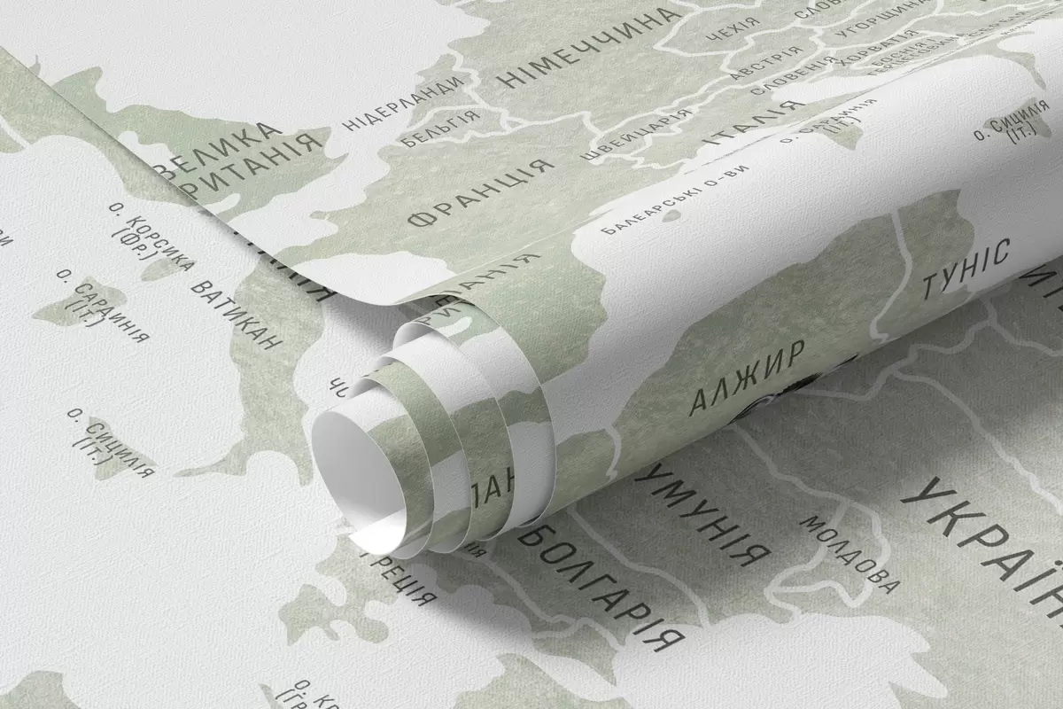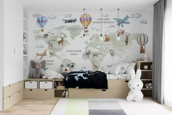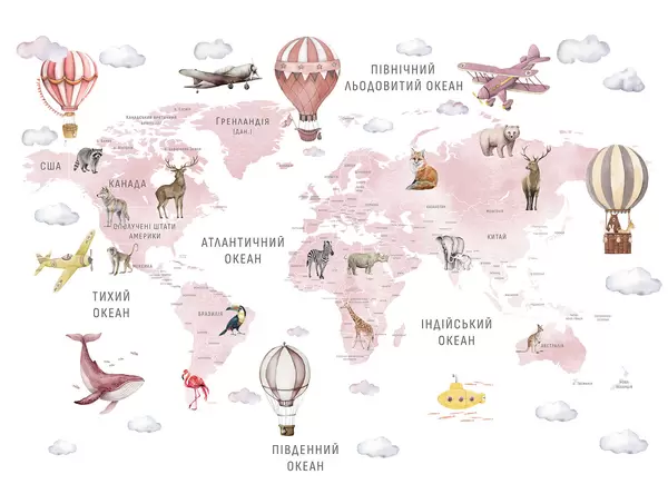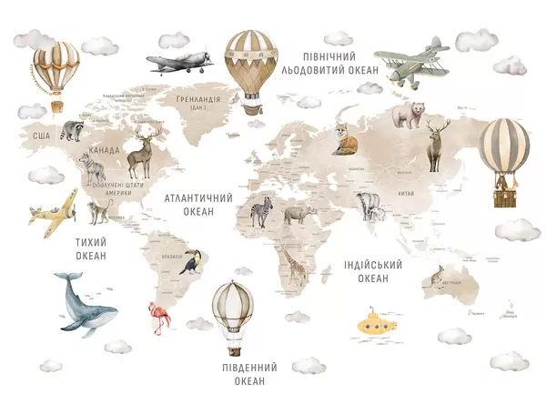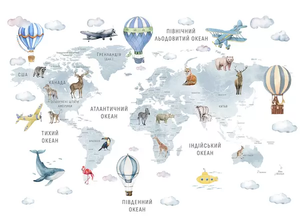 Fototapet Børnekort i akvarelstil med dyr og luftballoner. Ukrainsk sprog. Grøn farve. Nr. c00001uk