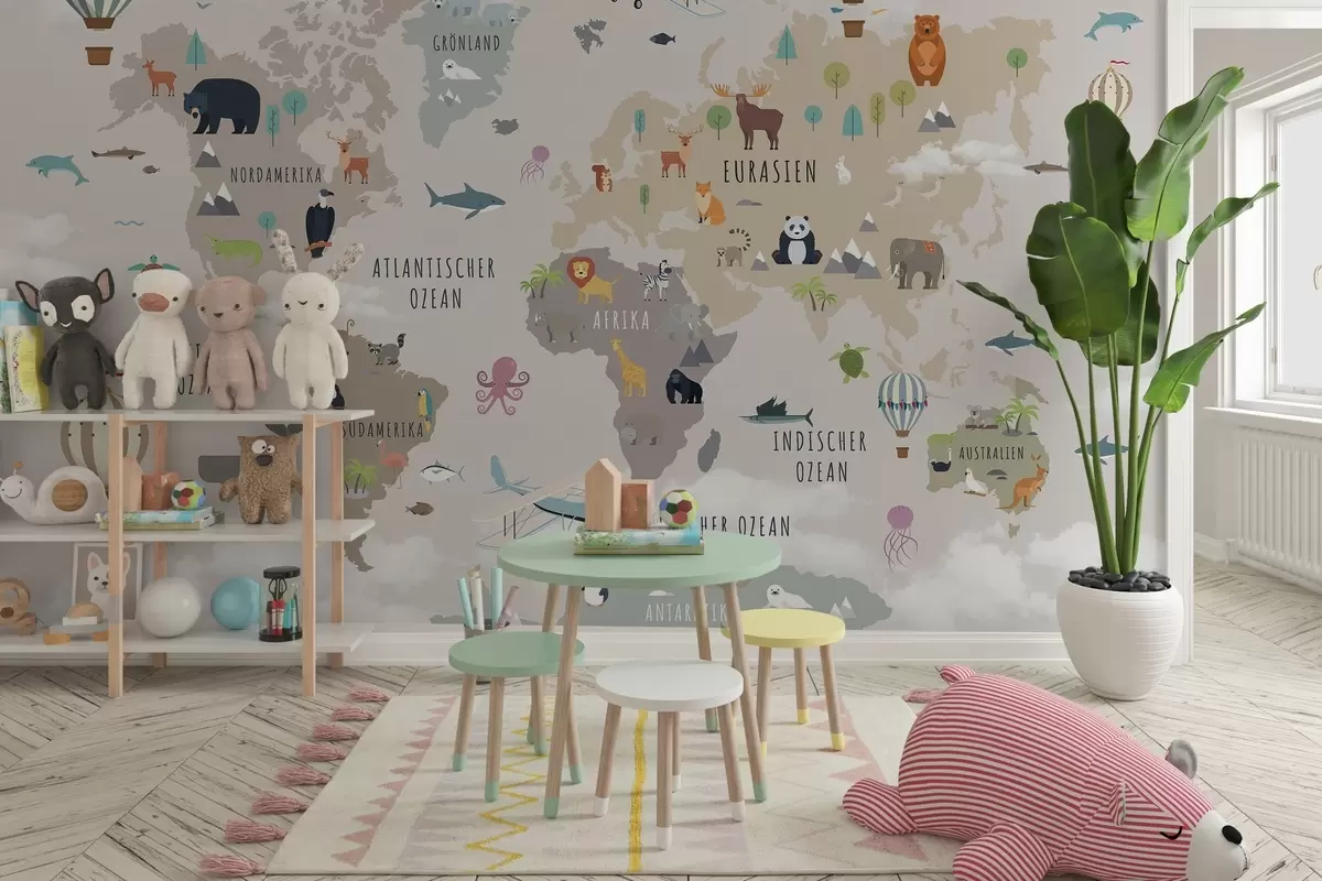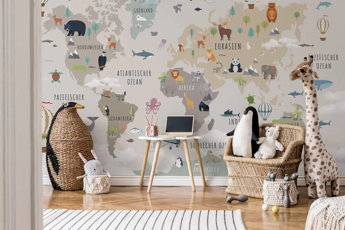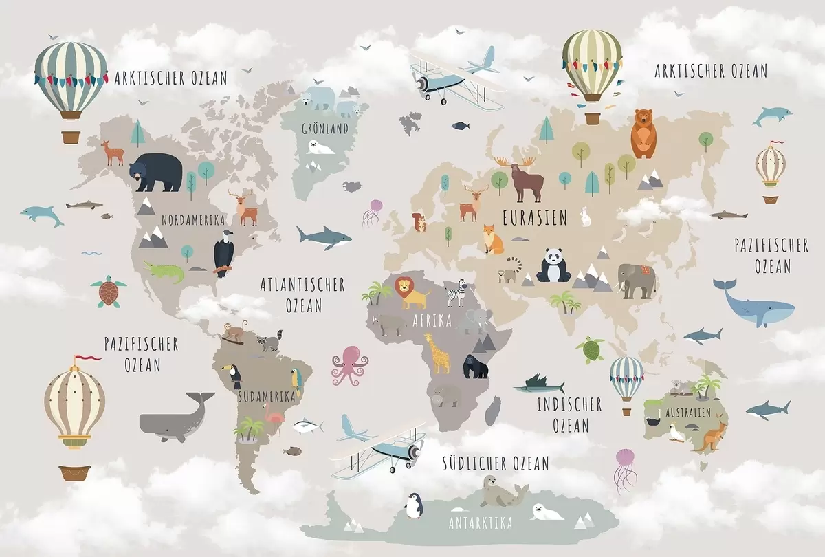 Fototapet Børns verdenskort med dyr og luftballoner. Tysk sprog Nr. c00002de
