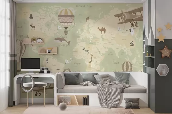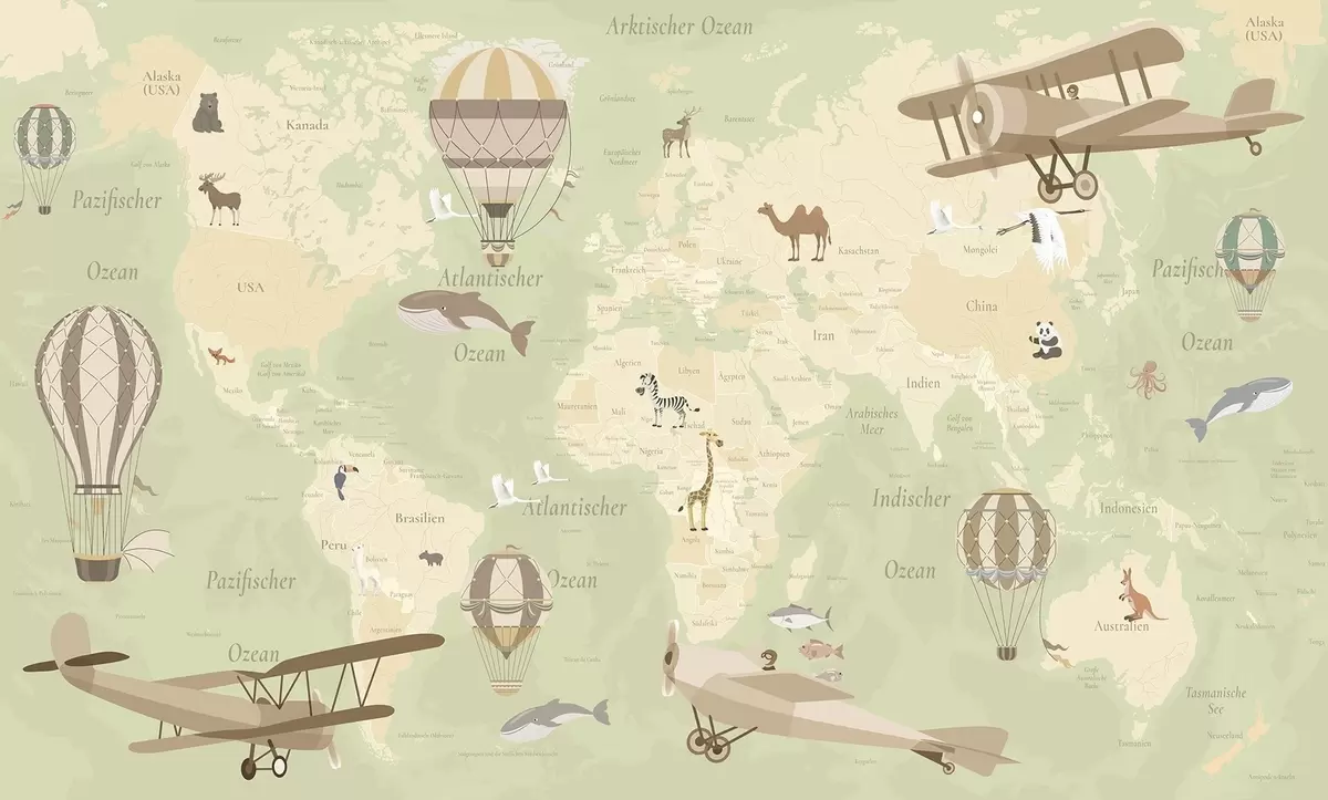 Fototapet Børnekort over verden med dyr, fly og luftballoner. Tysk sprog. Grøn farve. Nr. c00003dev2