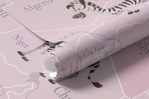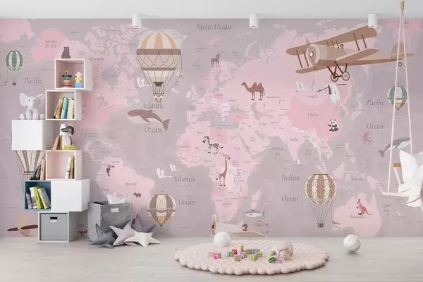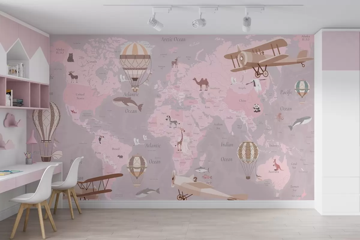 Fototapet Børns verdenskort med dyr, fly og luftballoner. Engelsk sprog. Lyserød farve. Nr. c00003env3