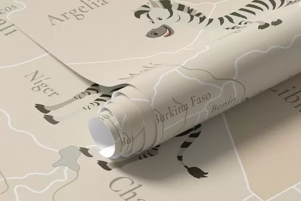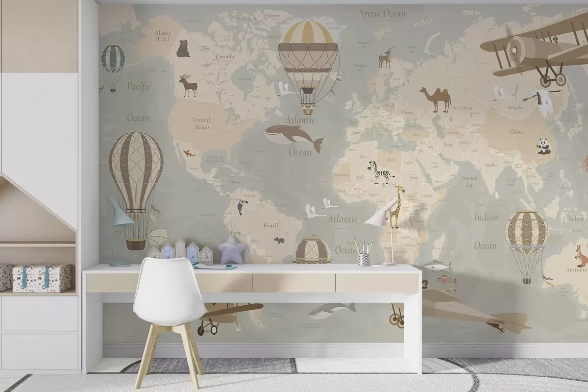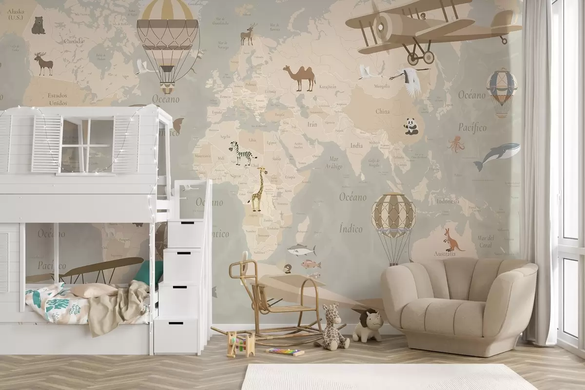 Fototapet Børnekort over verden med dyr, fly og luftballoner. Spansk sprog. Beige farve. Nr. c00003es