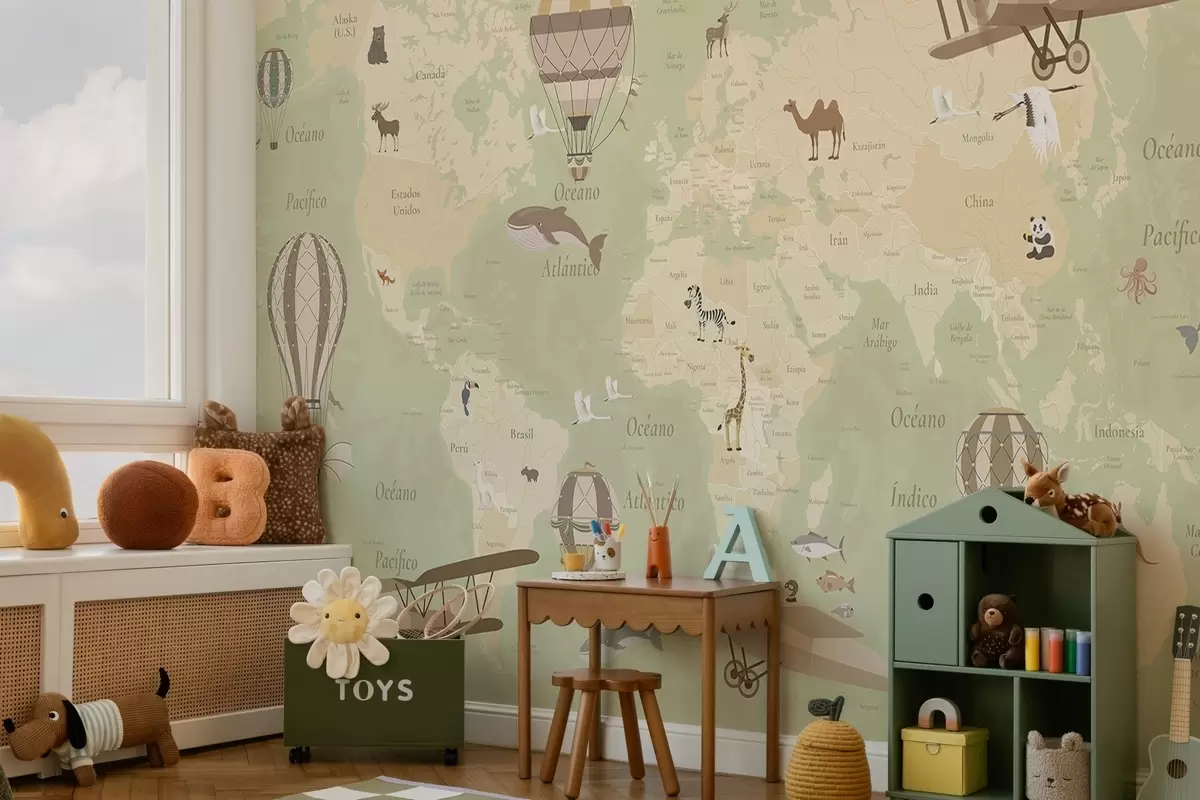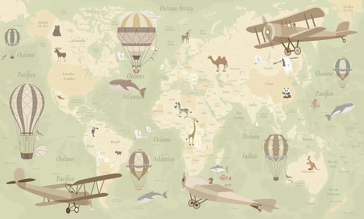 Fototapet Børnekort over verden med dyr, fly og luftballoner. Spansk sprog. Grøn farve. Nr. c00003esv2