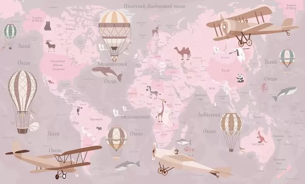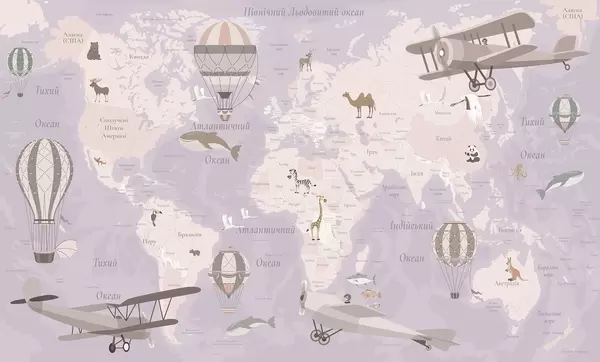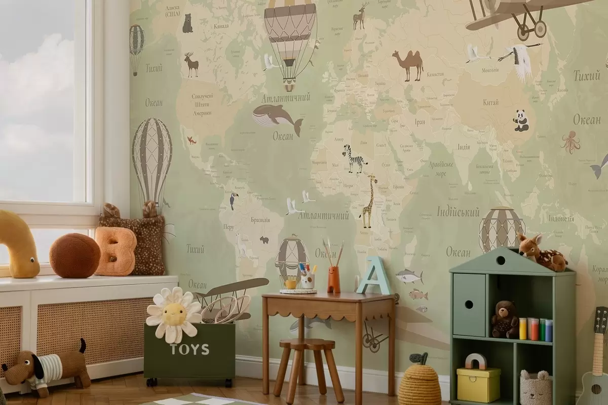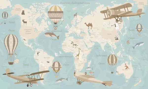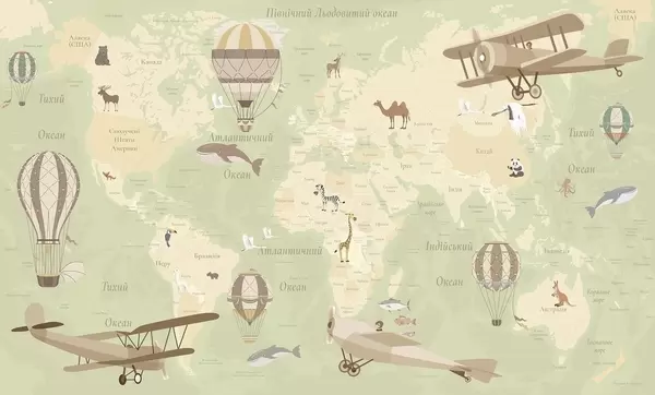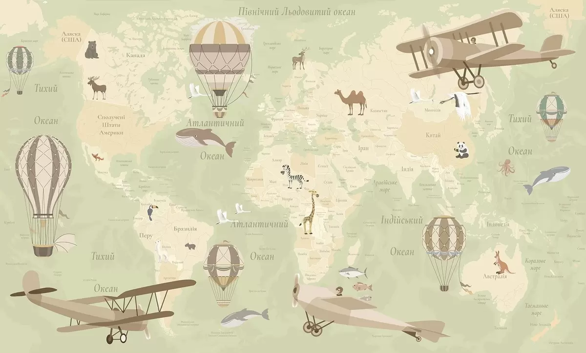 Fototapet Børnekort over verden med dyr, fly og luftballoner. Ukrainsk sprog. Grøn farve. Nr. c00003ukv2