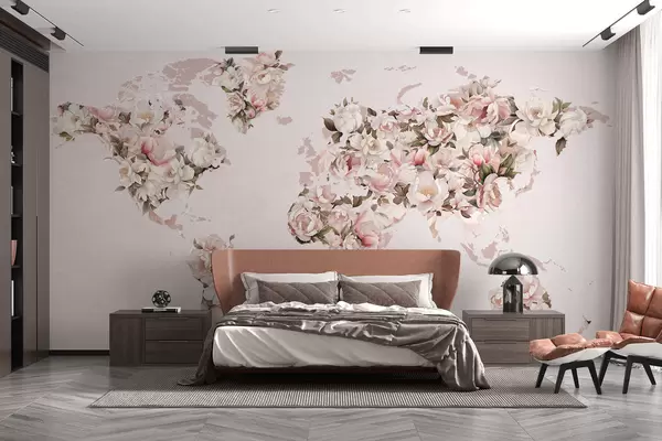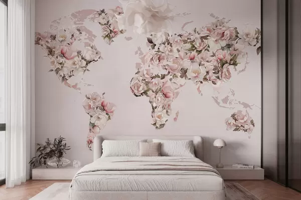 Fototapet Et lyserødt verdenskort lavet af store hvide og lyserøde pæoner Nr. c00005