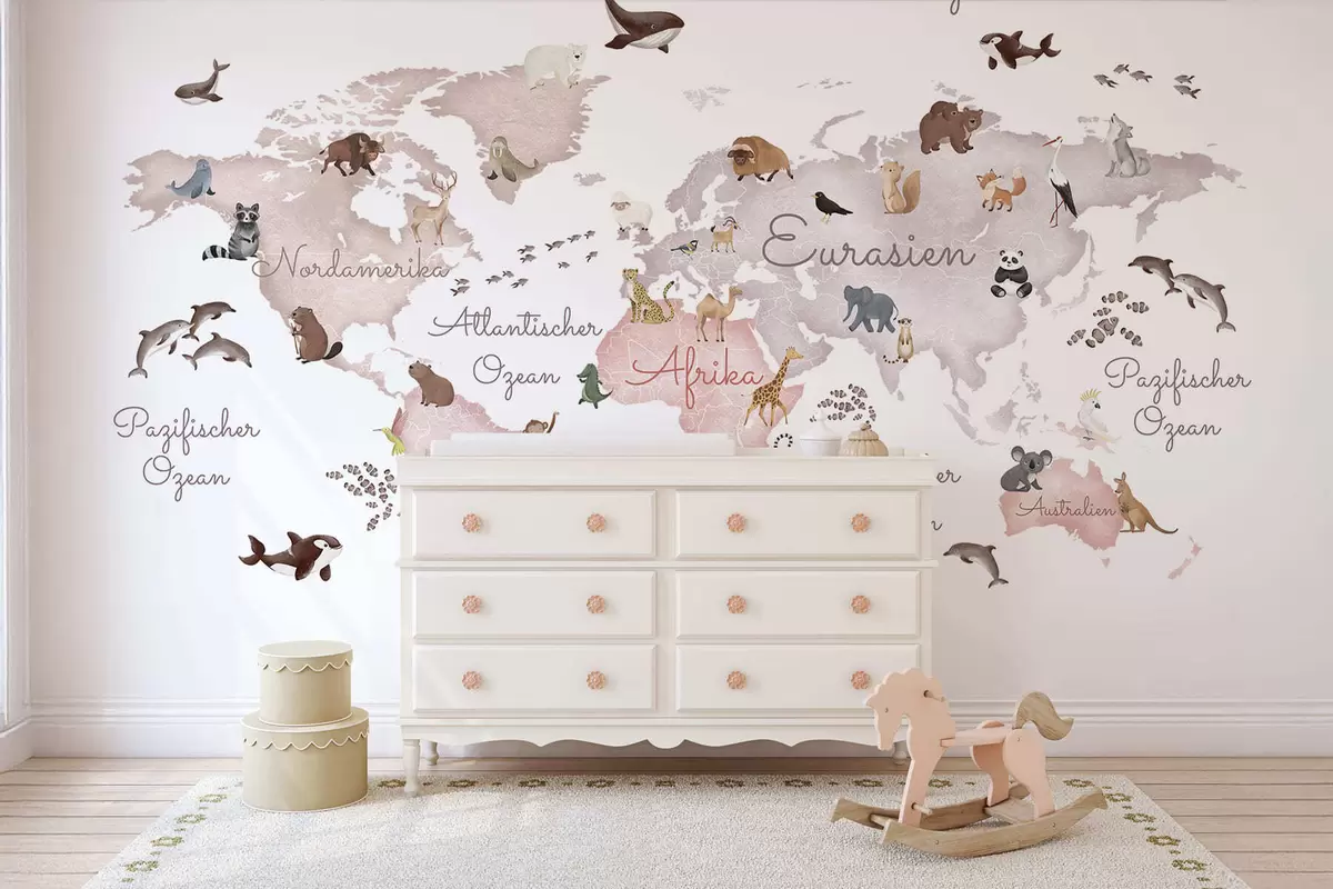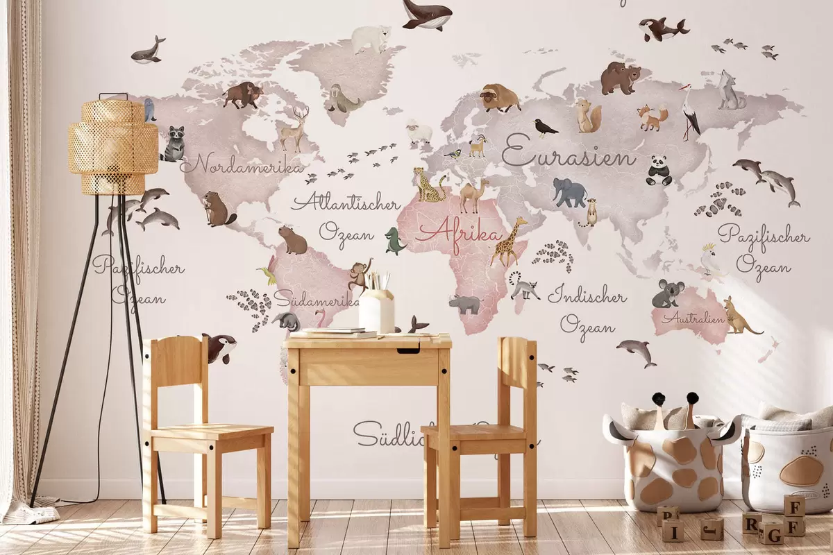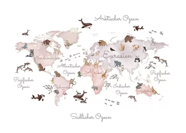 Fototapet Et kort i akvarelstil i beige med dyr. Tekster på tysk Nr. c00012dev3