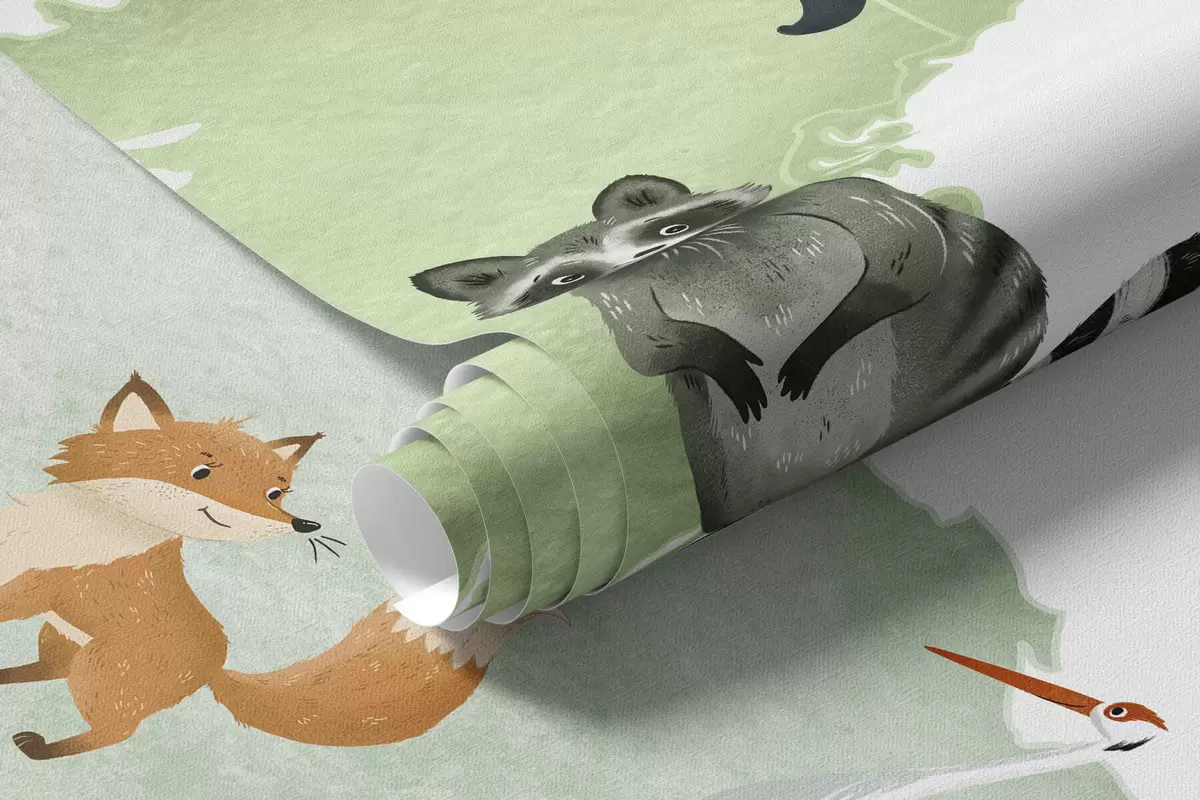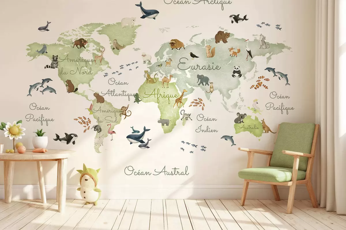 Fototapet Et grønt kort i akvarelstil med dyr. Tekster på fransk Nr. c00012frv2