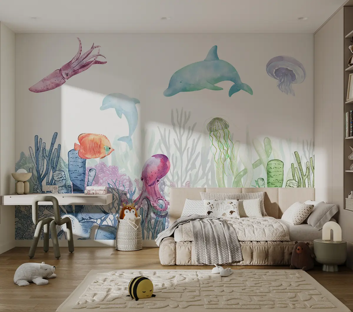 Fototapet Undervandsliv i havet, havdyr, akvarel, koraller, delfin, blæksprutte Nr. u98899