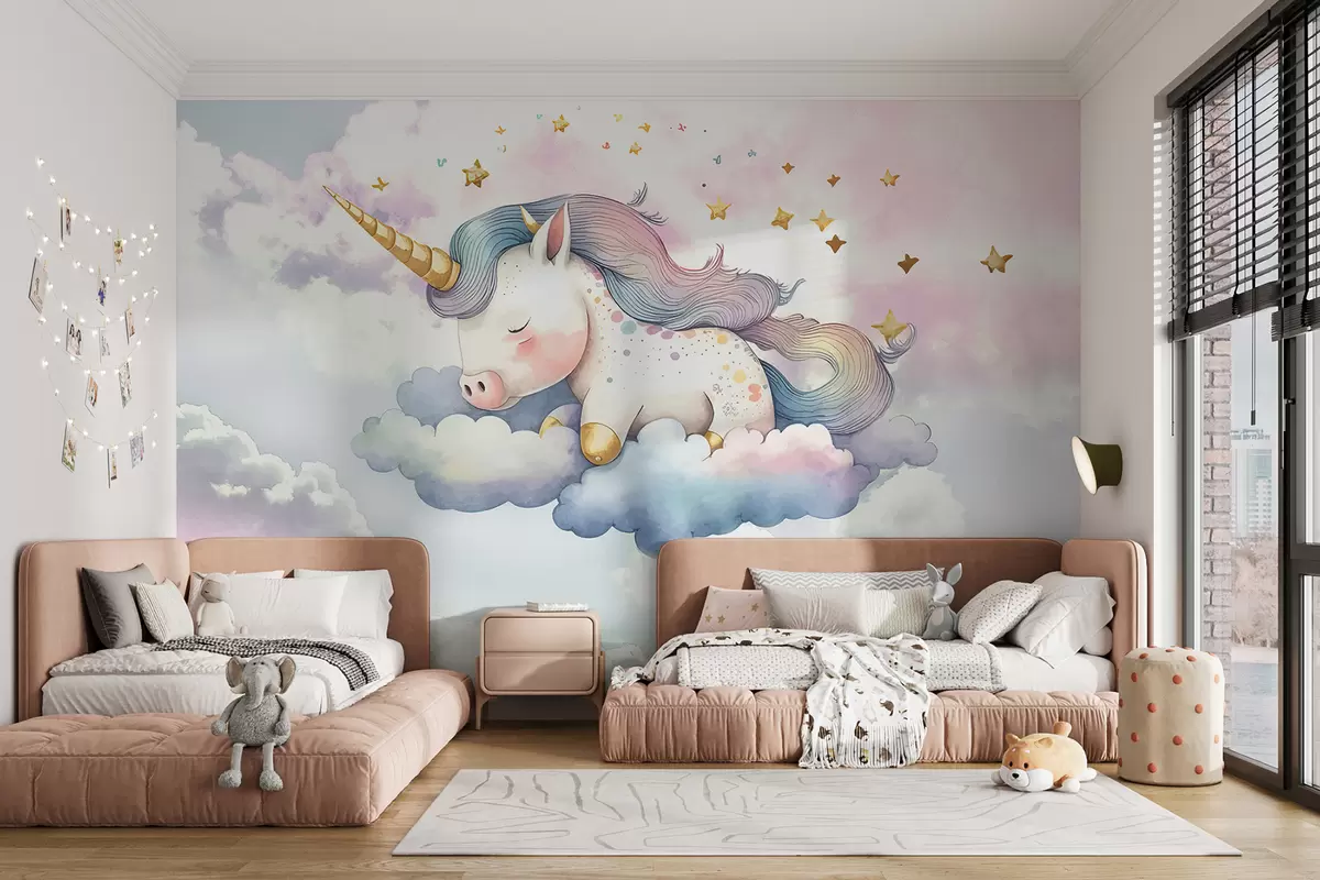 Fototapet En hvid enhjørning med en regnbuemanke og hale hvilende på en sky i en pastelfarvet himmel med stjerner Nr. w00799