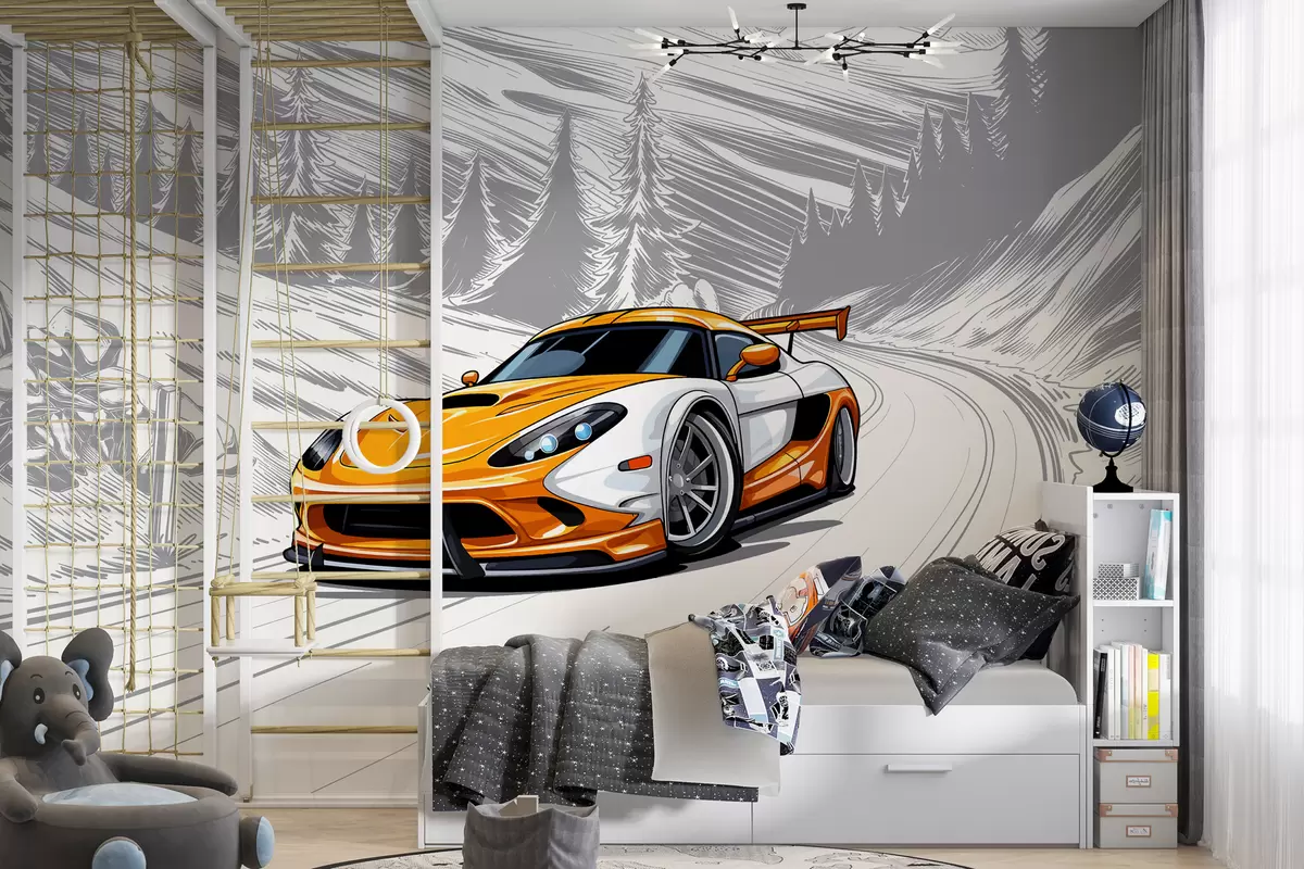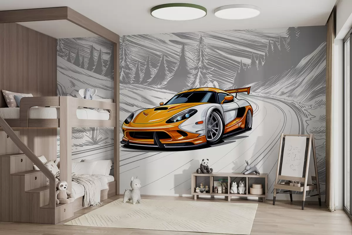 Fototapet En orange sportsvogn på en grå skitseret vejbaggrund blandt bjerge og grantræer. Til at dekorere et drengeværelse Nr. w00954