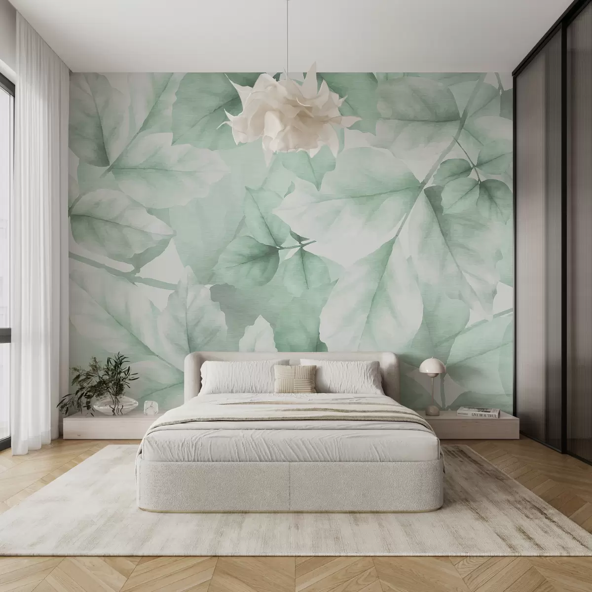 Fototapet Struktureret tapet med store blade i grønne pastelfarver Nr. w01090v3