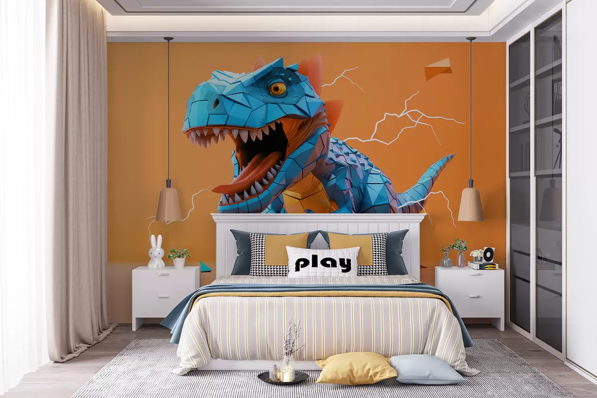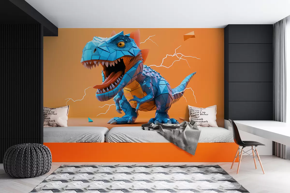 Fototapet Grusom dinosaur med et lynnedslag i gule og blå farver Nr. w01333v1