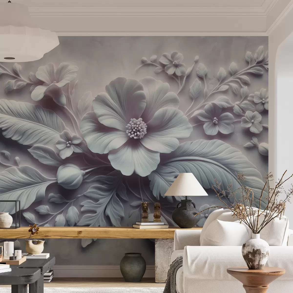 fototapeter 3D relief vægkunst med fjer og blomster, med en stor valmue i lyseblå farver w01340v2