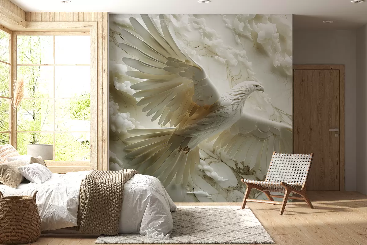 Fototapet 3D hvid ørn på en baggrund af skyer og marmor Nr. w01477