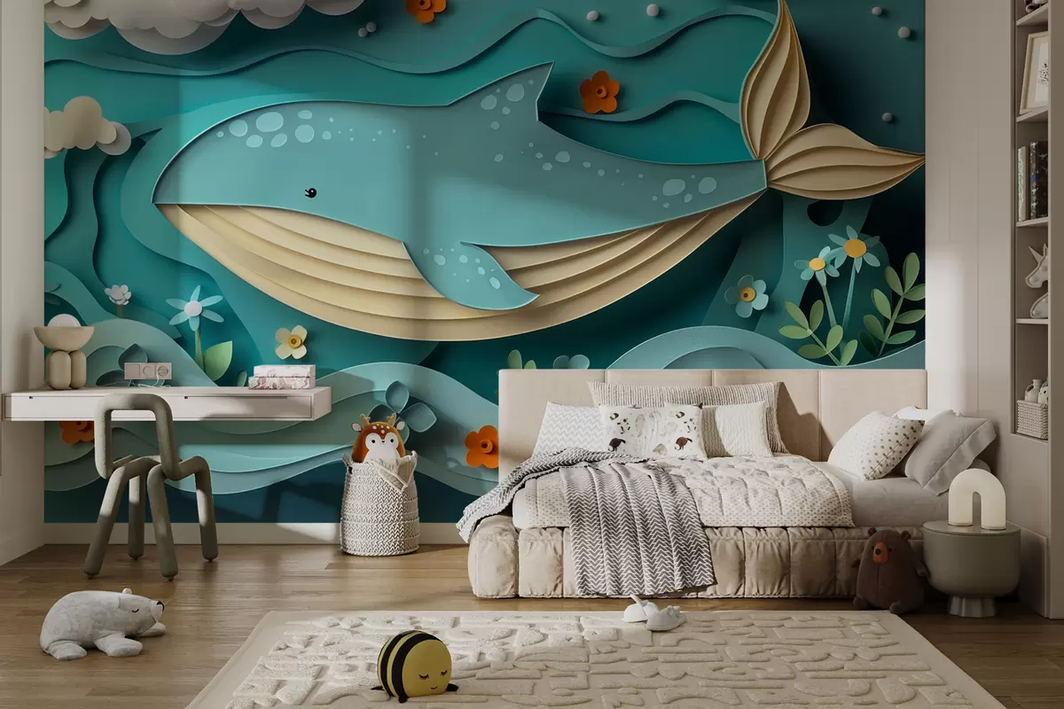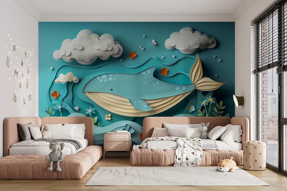 Fototapet Legende hval i skyerne i papirskåret stil, 3D-effekt Nr. w01496