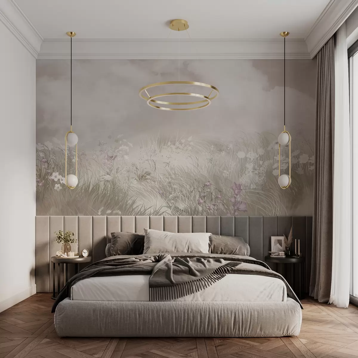 Fototapet Vilde blomster og græs med lyserød himmel og skyer Nr. w01624v4