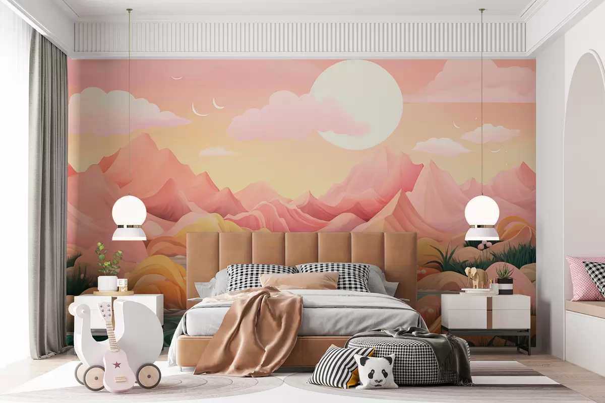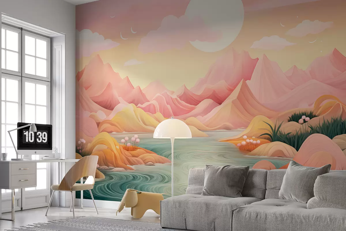 Fototapet Fantastisk, pastelfarvet landskab med sartrosa og ferskenfarvede bjerge Nr. w01656