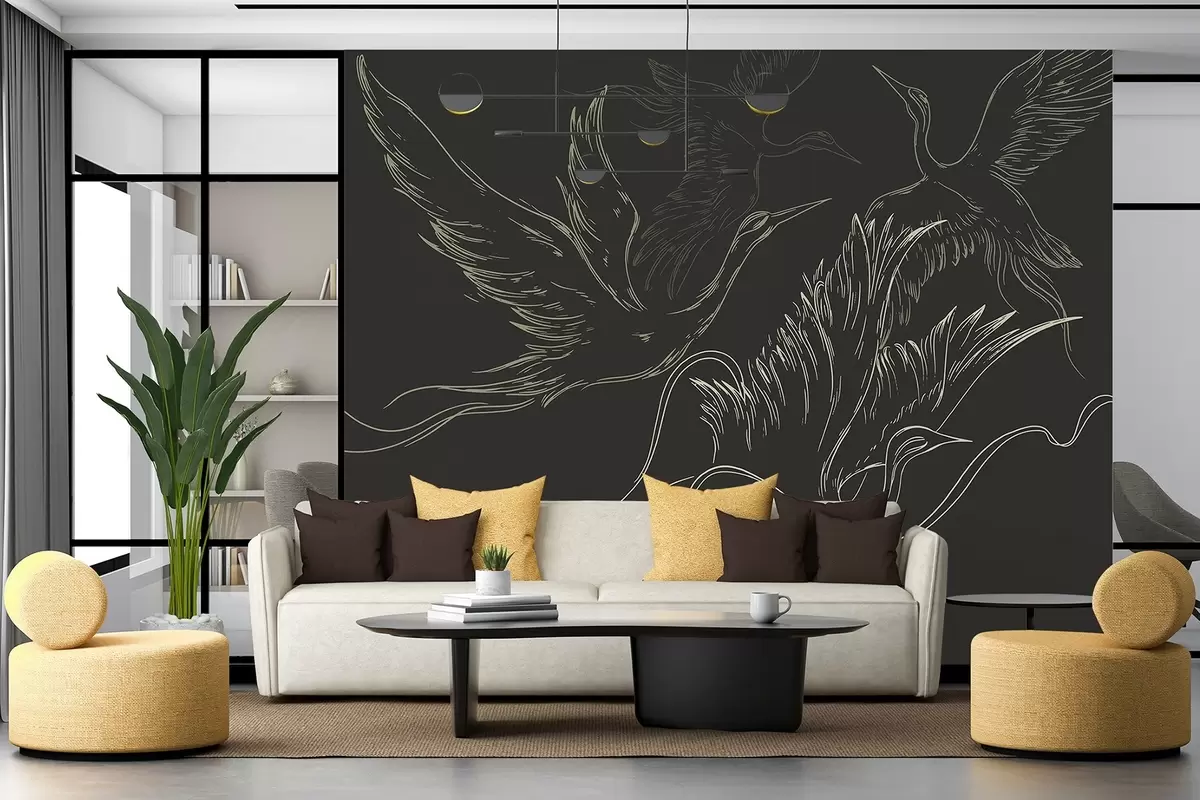 Fototapet Fugle, der flyver, minimalisme, stregtegning, natur, mørk baggrund Nr. w02061v3