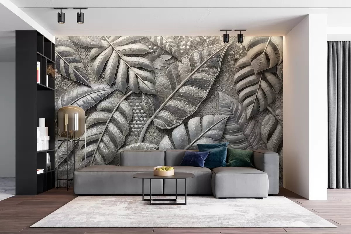 Fototapet Store tropiske blade i sarte sølvtoner, i en struktureret mosaikstil Nr. w02135