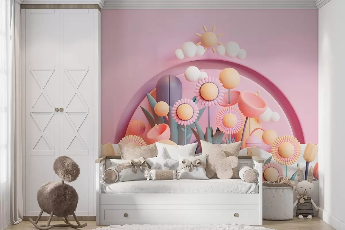 Fototapet Børnetapet i 3D-stil med blomster og skyer i rosa nuancer Nr. w02136