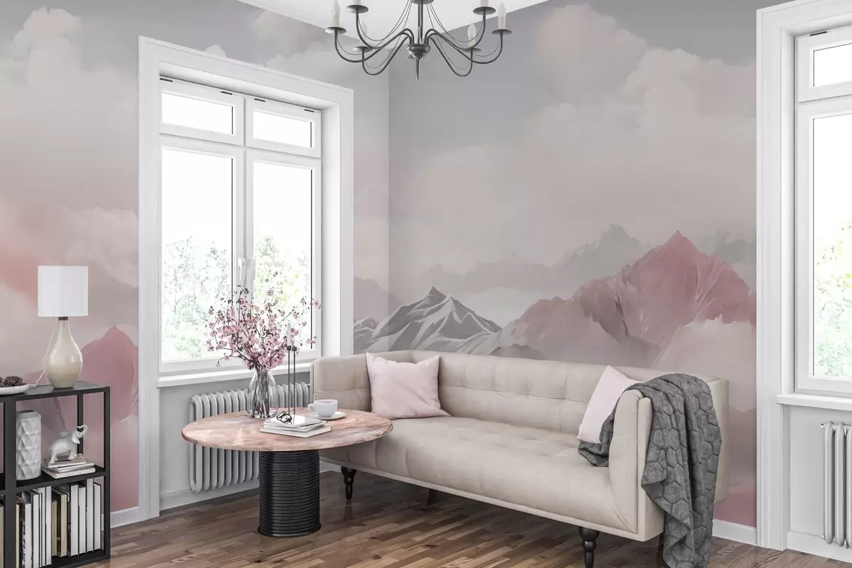 Fototapet Lyserøde bjerge i tåge og puffede skyer Nr. w02296