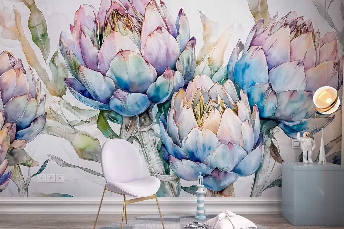Fototapet Artiskok-tegning, akvarel-stil, blomstret, lilla, beige, grøn Nr. w02484