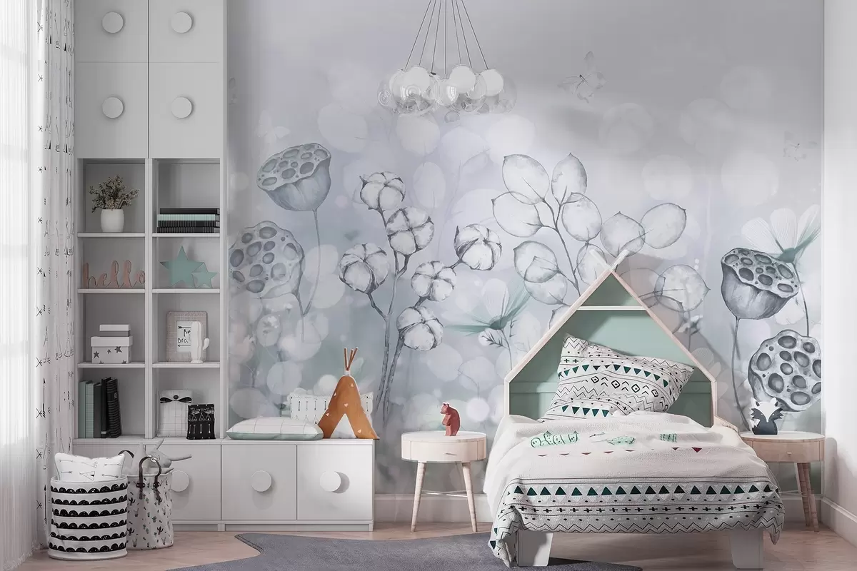 Fototapet Drømmende blomsterhave, sommerfugl, bomuldsblomster, lotus, grå farver Nr. w02516v2
