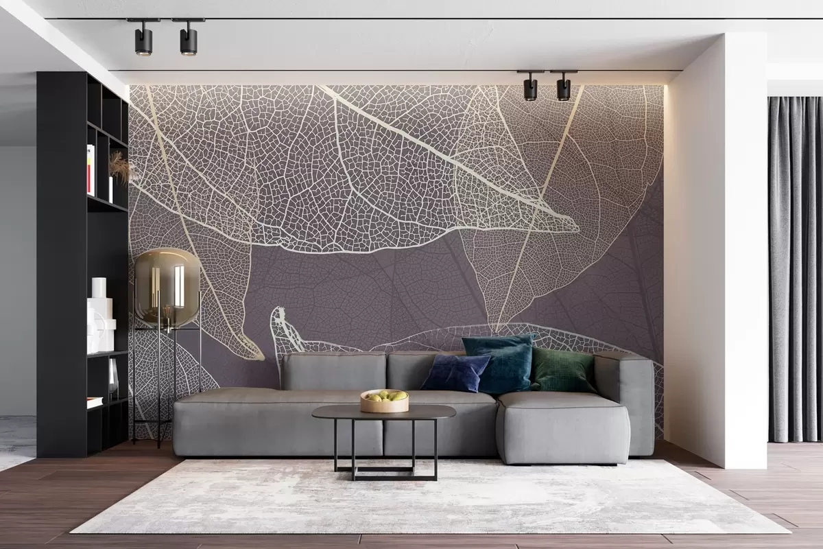 Fototapet nærbillede af blade med årer i lilla-grå toner Nr. w02520v3