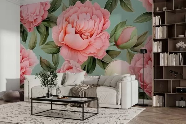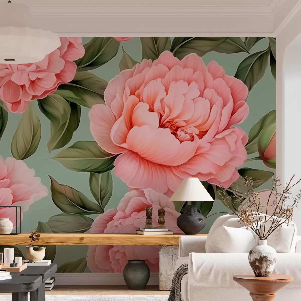 Fototapet Lyserøde pæoner med blade Nr. w02570
