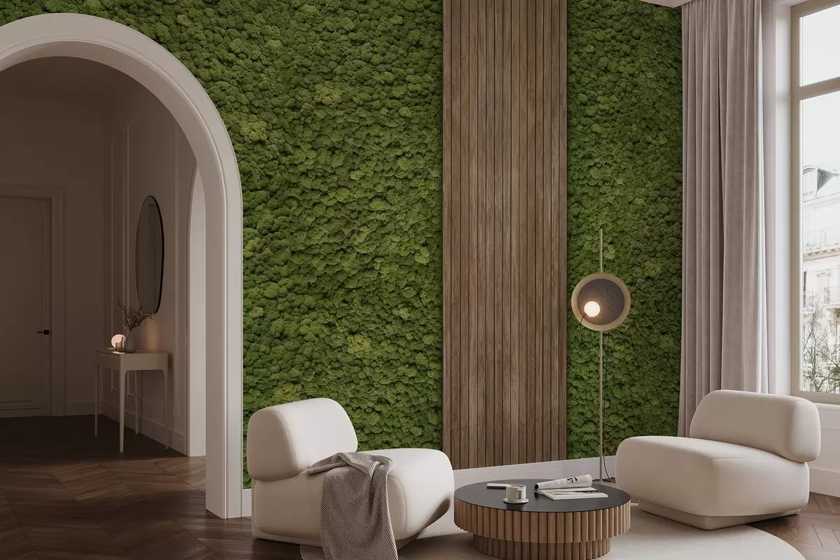Fototapet Væg i mos-stil med træpanel, frodige olivenfarver Nr. w02656v3