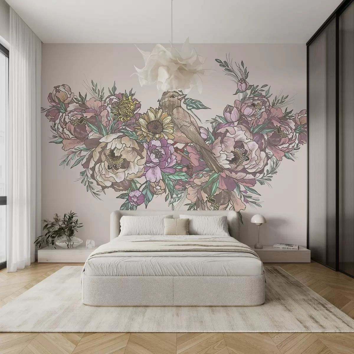 Fototapet Vintage illustration af fugle og blomster Nr. w02833