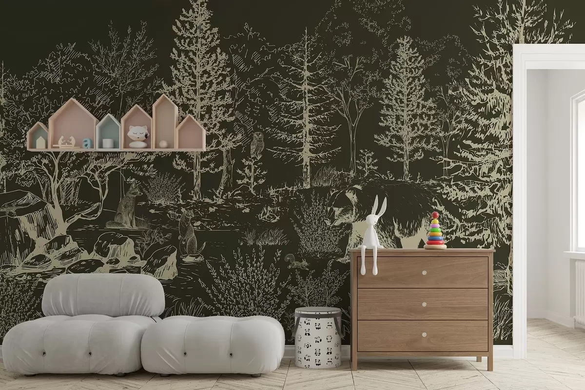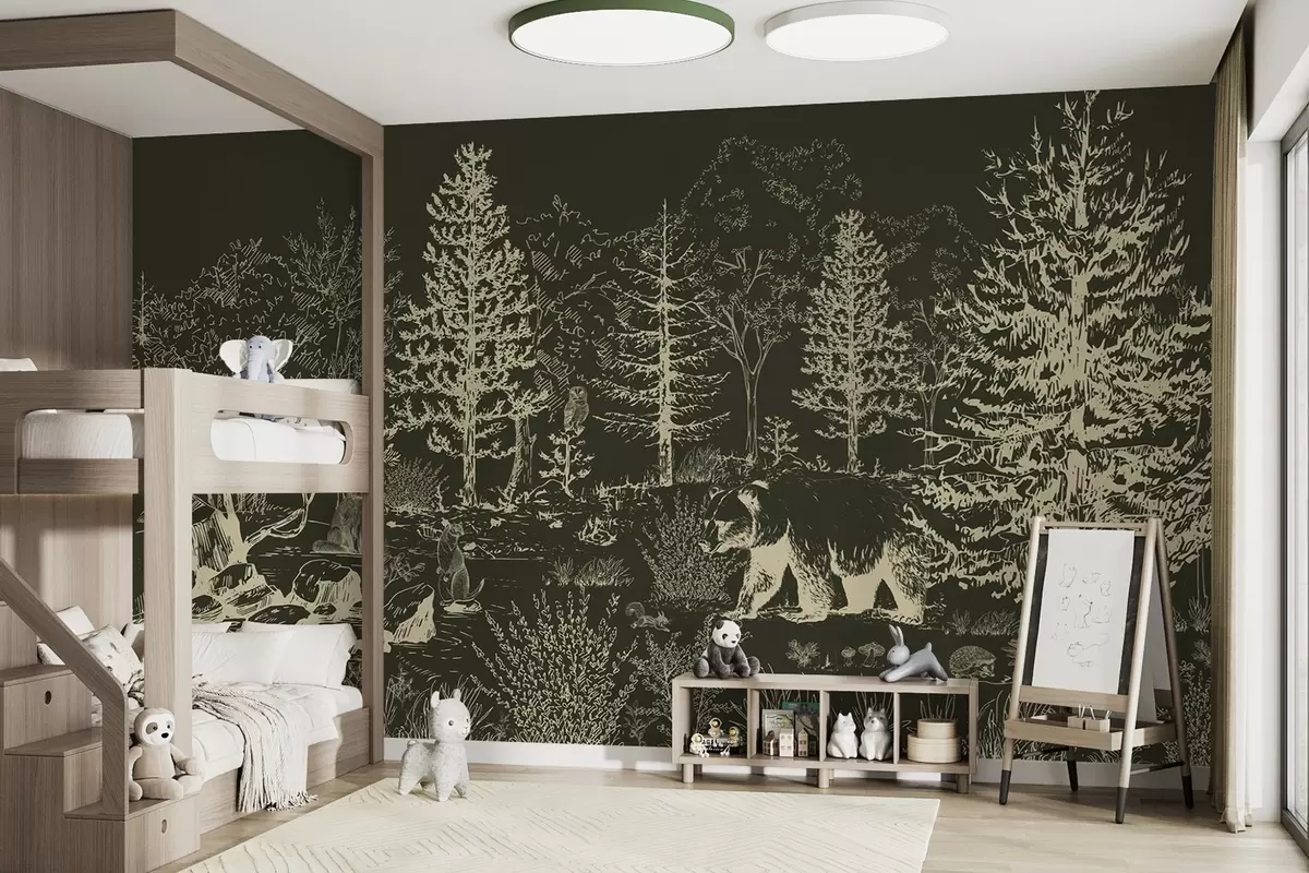 Fototapet Skovliv, træer, vilde dyr, bjørn, ræv, ugle, buske, mørkegrøn baggrund Nr. w02929v3