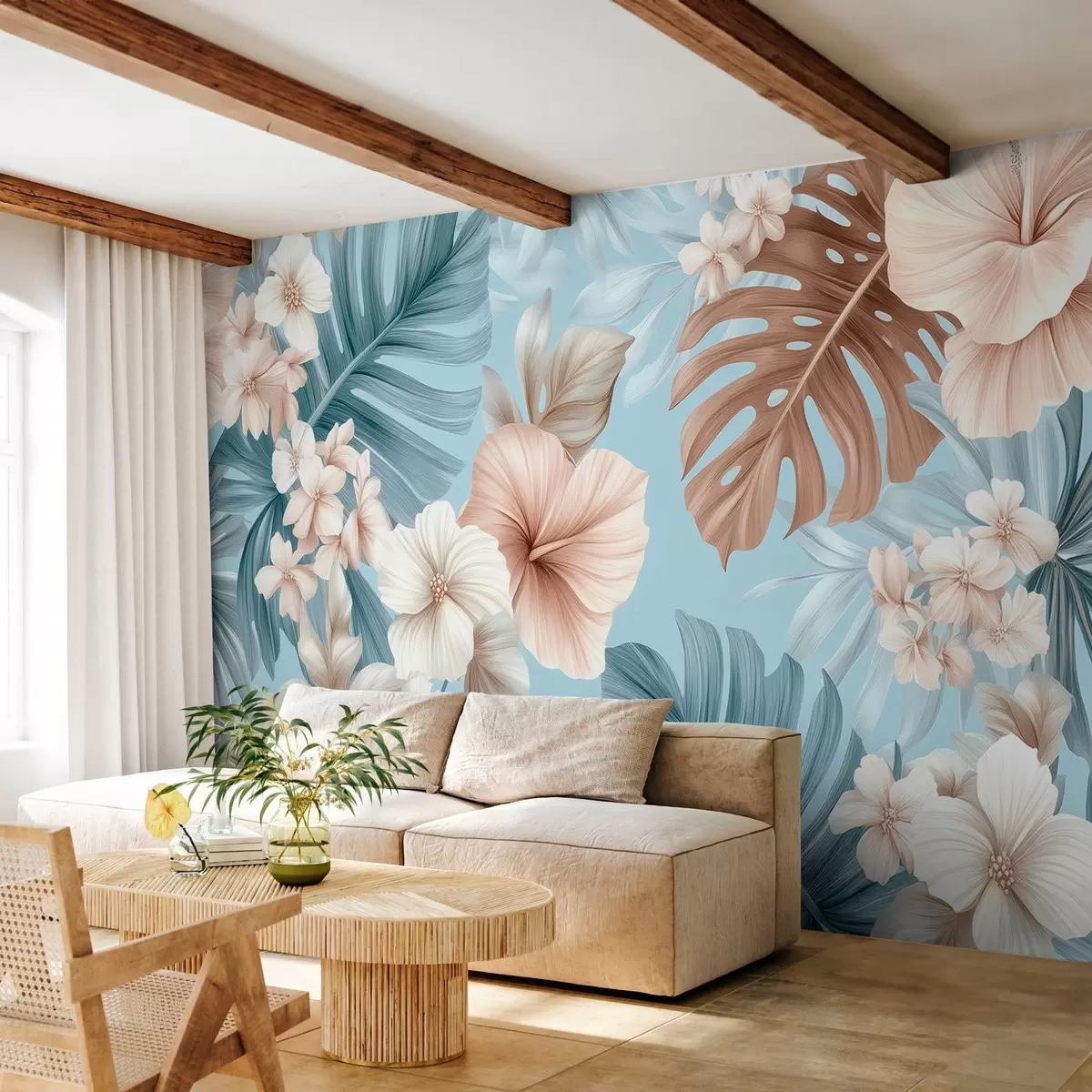 Fototapet tropisk print med store blade og blomster i pastelblå og beige farver Nr. w03013