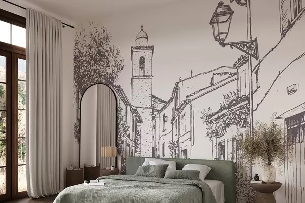 fototapeter Byens gade, smuk arkitektur, bygninger, Middelhavet, stregtegning, beige farve w03345v1