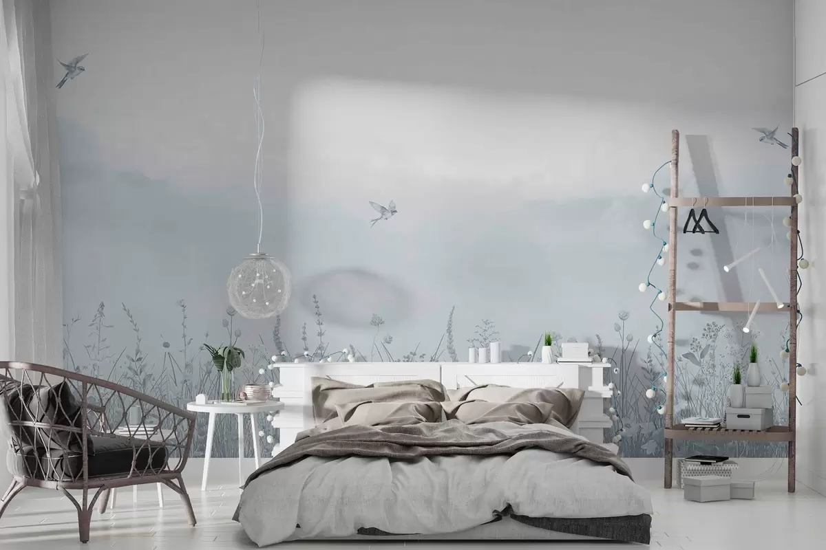 Fototapet Vilde blomster og diset himmel i blå toner Nr. w03391v1