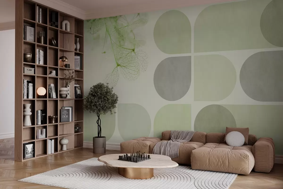 Fototapet geometri og tørrede blomster med årer i grønne toner Nr. w03617v1