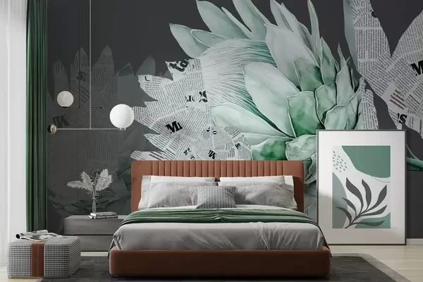 Fototapet Protea-blomster, aviskunst, blomster, tropisk, mørk baggrund, grønne farver Nr. w03667v3