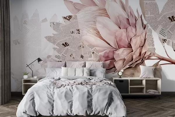 Fototapet Protea-blomster, aviskunst, blomster, tropisk, pastelbeige farver Nr. w03667v4